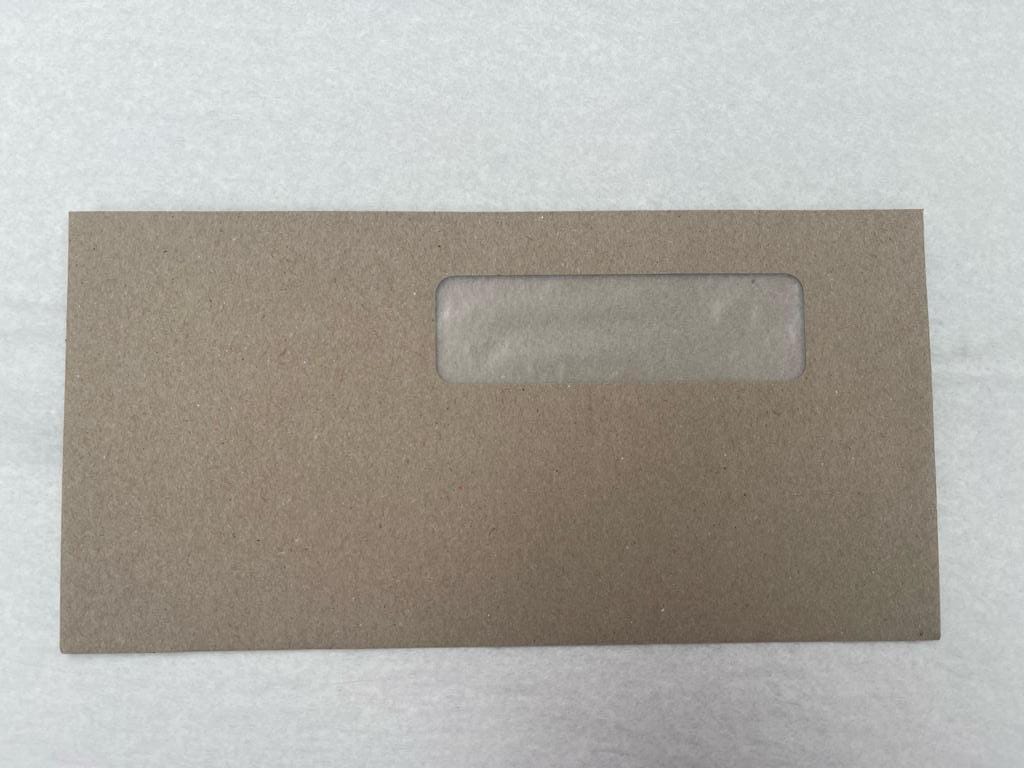 Eco DLX 100% recycled paper envelopes; 120 x 235mm; window face; banker style; natural unbleached; Moist Seal. Box of 500