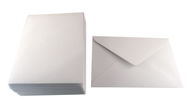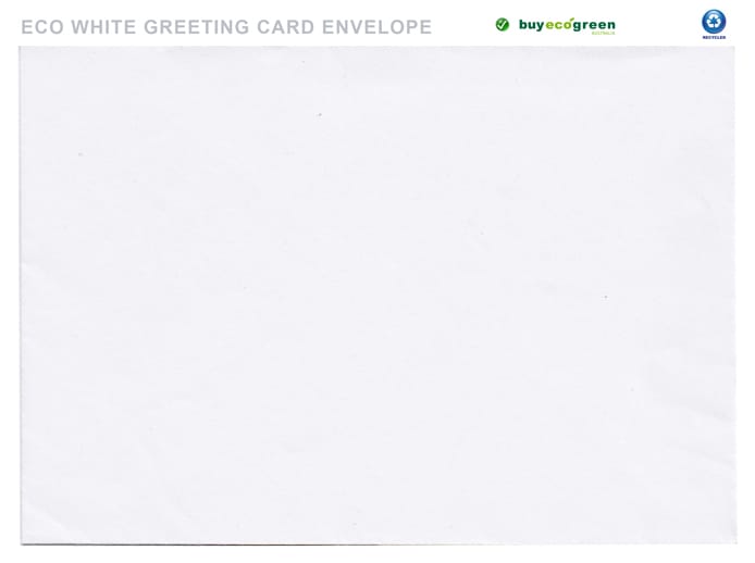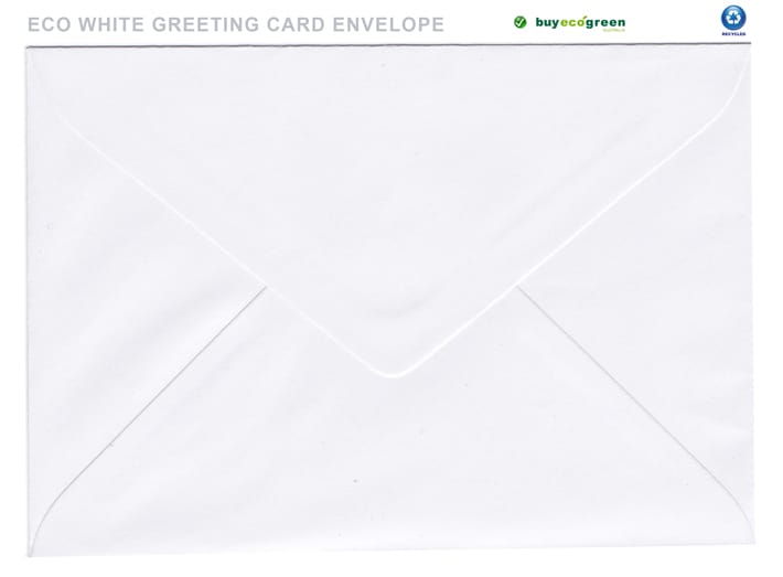Eco White 100% recycled envelopes, 131 x 182mm. This is the size for our Greeting Cards in Eco White and Eco Brown. Made from text weight printing paper; 120gsm; Bright White; 100% recycled post-consumer and FSC certified. Process Chlorine Free (PCF); ISO 14001 FSC Certified Mill. Banker. Lick & Stick closure.