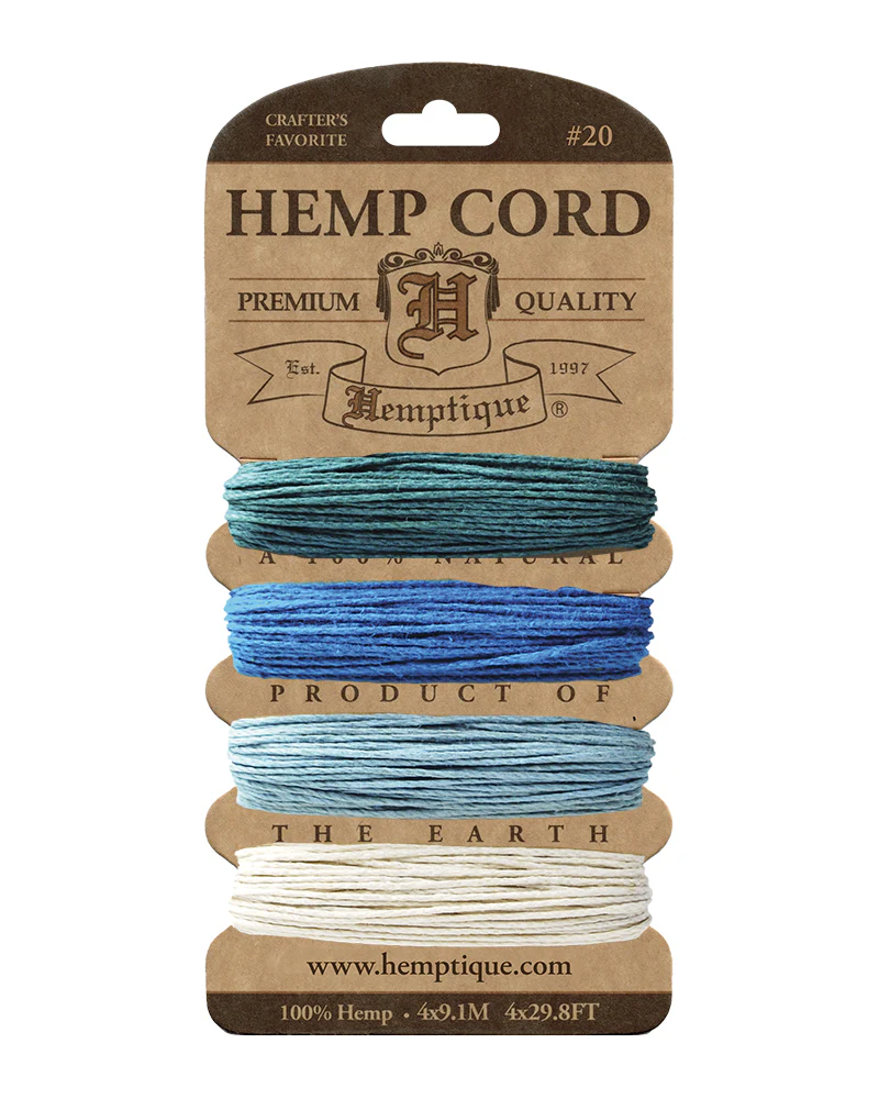 Hemp Cord Cards offer the versatility of several colour combinations to get you started on even more creative projects with jewellery making, scrapbooking, macramé, greeting cards, gift wrapping, crochet and more. 100% hemp. Approx 1mm thickness. 20 lbs breaking strength (= just under 10kgs). 4 colours x 9.1m length: shades of Aquamarine. Dusty Green/Turquoise/Dusty Blue/White.