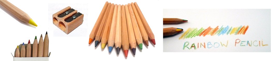 Our sustainable timber range includes short colour pencils, extra thick colour pencils, standard and extra thick Rainbow pencils, thick highlighter pencils, and wooden double sharpeners.