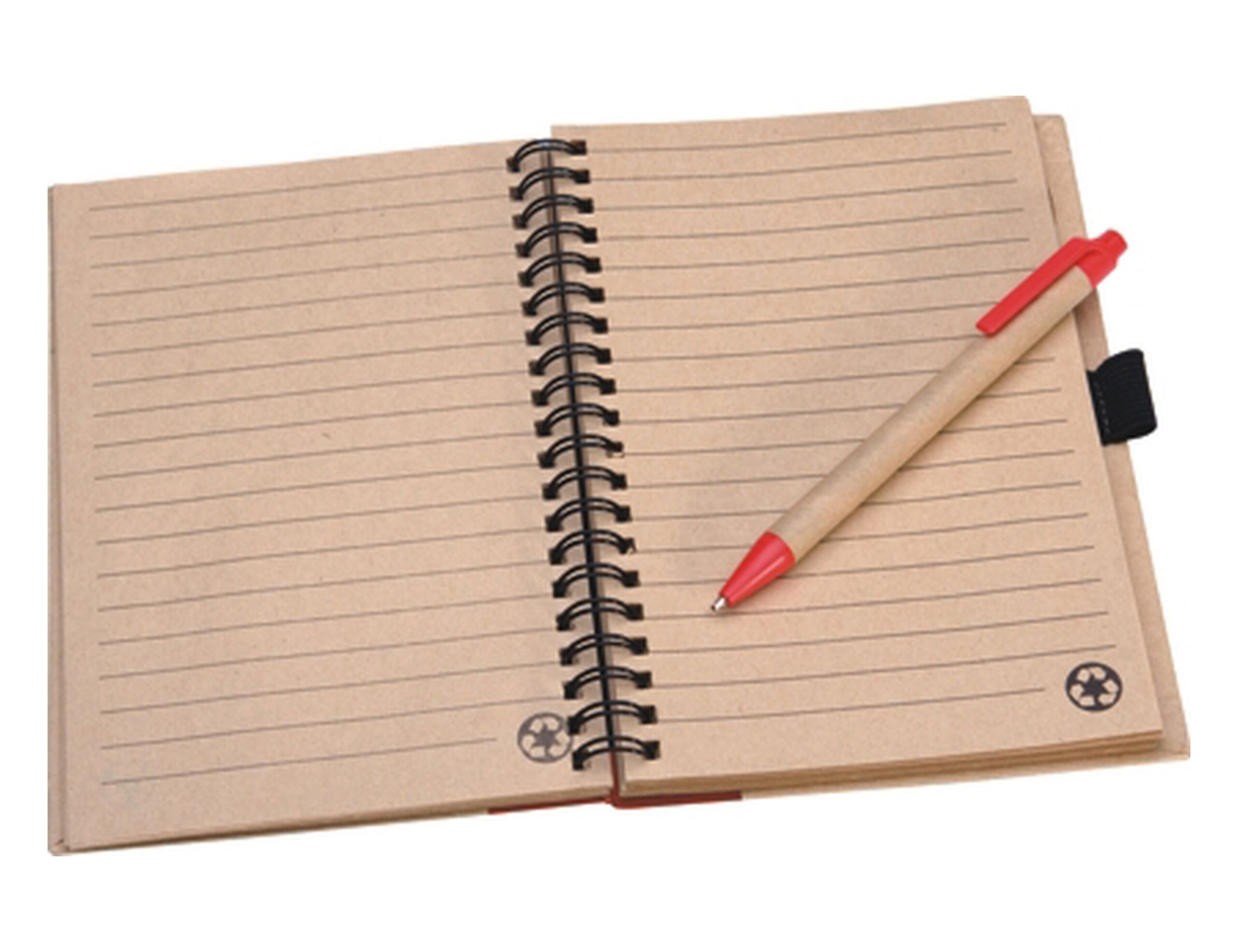 Lined recycled paper with recycling symbol in corner of each page. 160 pages. Size: 178 x 135mm