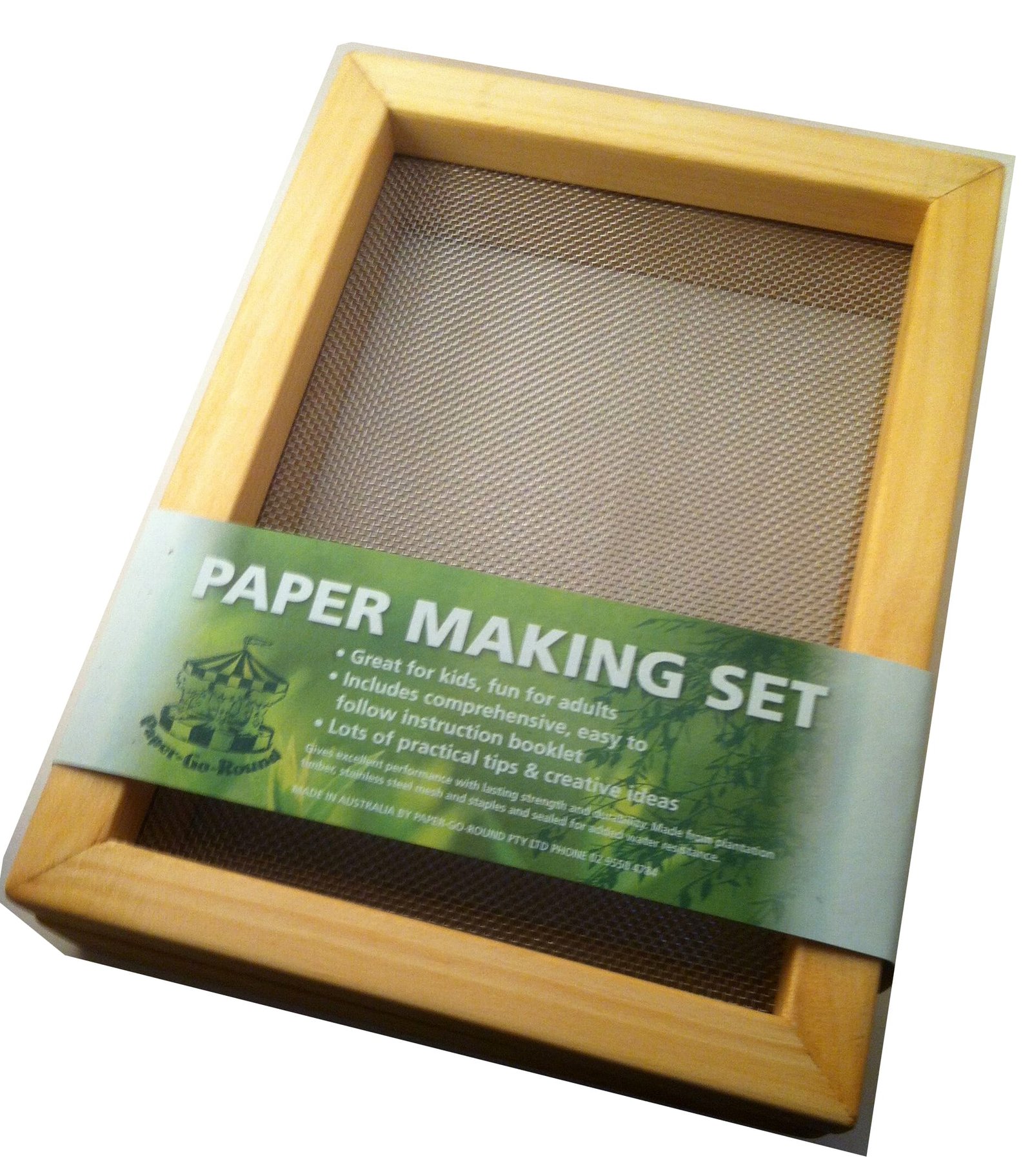 The A5 Paper Making Set is hand-crafted in Australia from Australian plantation timber and strong stainless steel mesh. Unlike cheap imitations or toy sets, the use of stainless steel mesh means no sagging, no rust, and results in a long-term serious piece of equipment. The plantation grown timber is carefully finished and sealed with natural citrus-based oil to give added water resistance and longer life.