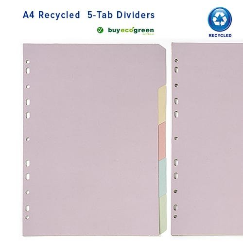 Recycled A4 Dividers, 5-Tab and in assorted colours. Made from 100% recycled paper. A Marbig quality product.