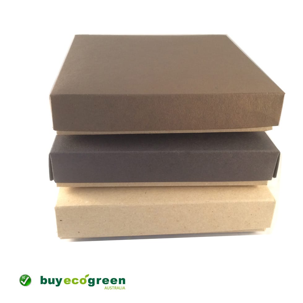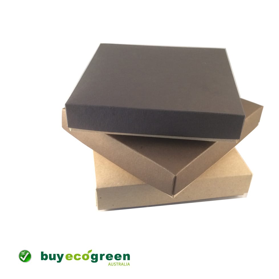 Recycled Gift Box C6 (125 x 175mm) and 30mm high. 100% recycled paper-board gift box made in Australia. Natural recycled kraft base with Black lid. Supplied as a flat base with drop on lid. Ideal for stationery, jewellery, confectionery, or small lightweight gifts. Perfect for customising your special gift. The sustainable way to give! Pack of 5 lids and bases.